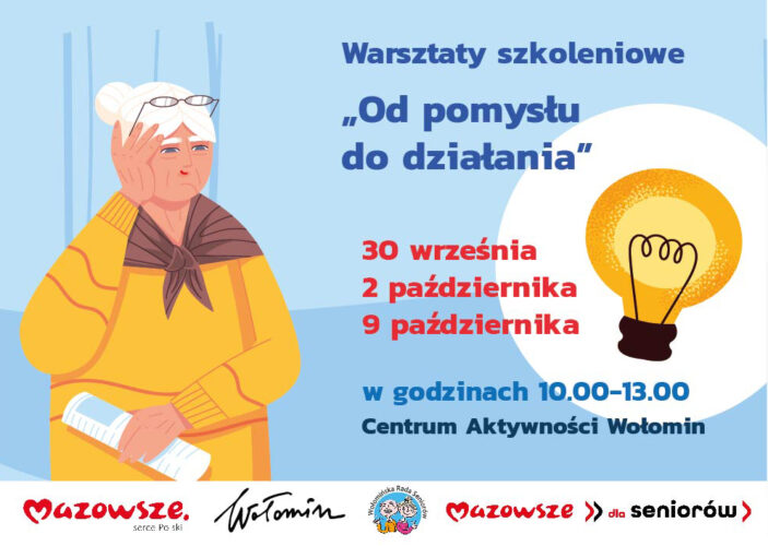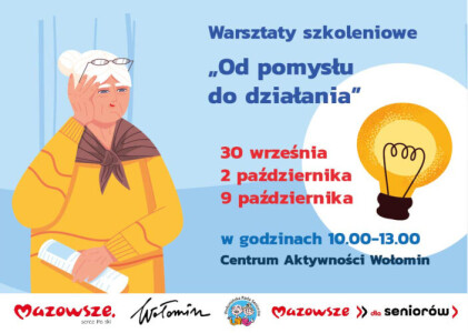 Drodzy Seniorzy z Gminy Wołomin, zapraszamy Was serdecznie na „Warsztaty szkoleniowe: od pomysłu do działania”, które poświęcone będą zwiększeniu kompetencji seniorów, ich aktywizacji, zachęcaniu do działania i zakładania grup nieformalnych, dzięki którym istnieje możliwość pozyskiwania dofinansowań na działania.