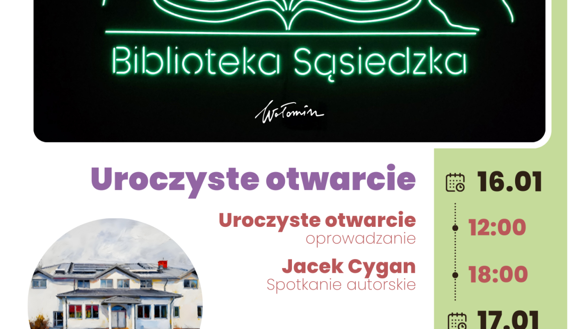 W dniach 16–17 stycznia odbędzie się uroczyste otwarcie Biblioteki Sąsiedzkiej w Lipinkach – nowej przestrzeni publicznej stworzonej z myślą o mieszkańcach i przy ich aktywnym udziale. To efekt współpracy samorządu, zespołu Biblioteki, radnych, sołtys Urszuli Zych oraz lokalnej społeczności.
