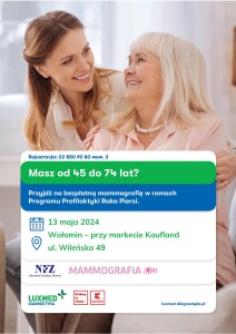 LUX MED Diagnostyka zaprasza Panie w wieku od 45 do 74 lat na bezpłatne badania mammograficzne w ramach Programu Profilaktyki Raka Piersi finansowanego przez NFZ.
