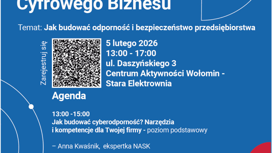 Udział jest bezpłatny, obowiązuje wcześniejsza rejestracja. Link: https://wolomin.wdialogu.pl/konsultacje/ankieta/cyfrowa-tarcza-dla-biznesu-jak-budowac-odpornosc-i-bezpieczenstwo-przedsiebiorstwa-spotkanie-dla-przedsiebiorcow,WGBW