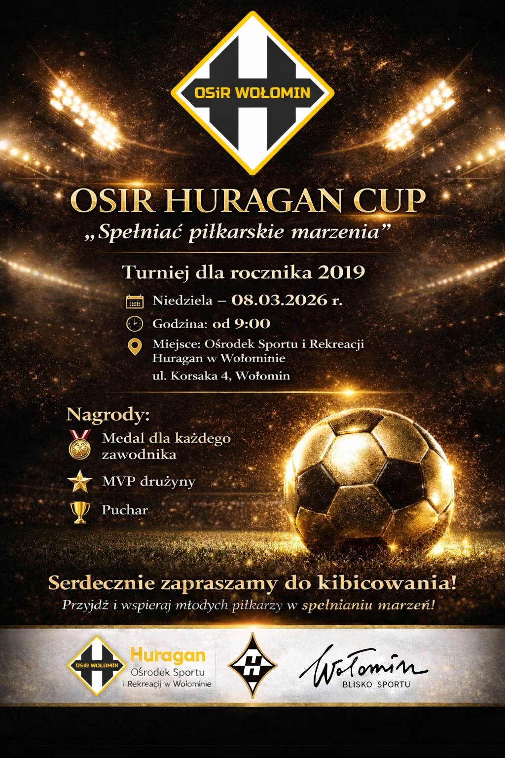 Turniej organizowany jest we współpracy z Akademią Piłkarską Huraganu Wołomin, która każdego dnia wspiera młodych zawodników w rozwijaniu ich sportowej pasji.